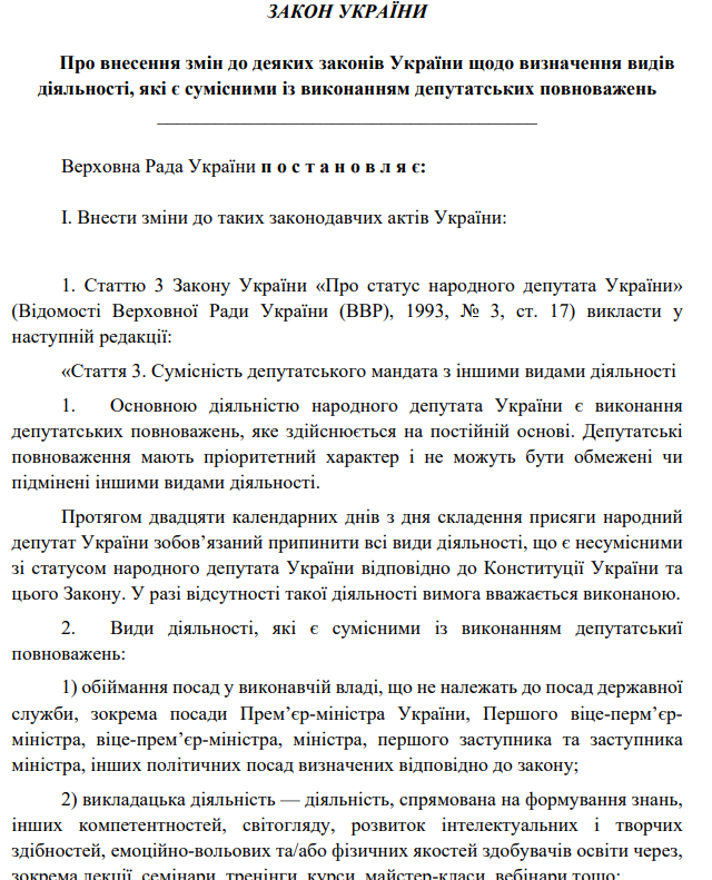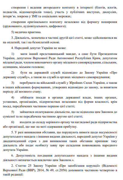 Народные депутаты Украины не могут занимать другие оплачиваемые должности, кроме четко определенных законом исключений. Основные нормы относительно этого содержатся в Конституции Украины и Законе Украины "О статусе народного депутата Украины".