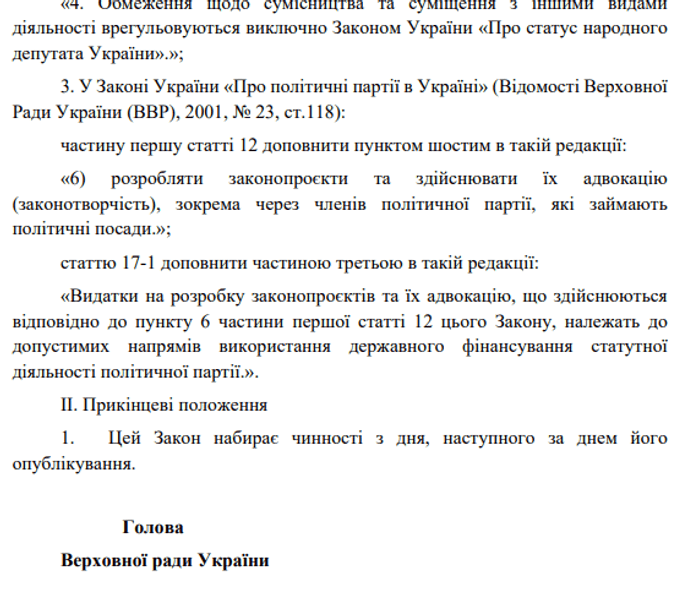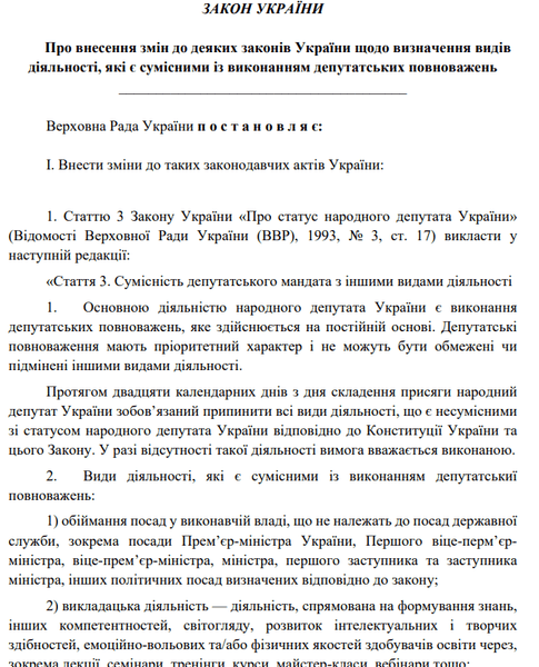 В законопроекте говорится о внесении изменений в Закон "О статусе народного депутата Украины". Согласно документу, выполнение министерских обязанностей не будет считаться несовместимым с мандатом депутата, поскольку такие должности не являются государственной службой в понимании Конституции Украины. Они относятся к политическим должностям.