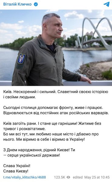 "Сегодня столица помогает фронту, живет и работает. Восстанавливается от постоянных атак российских варваров. Киев заживет раны. И станет еще красивее! Будет жить без тревог и расцветать. Потому что мы все здесь, мы любим наш город и заботимся о нем. Мы верим в себя и верим в Украину!" — написал он.