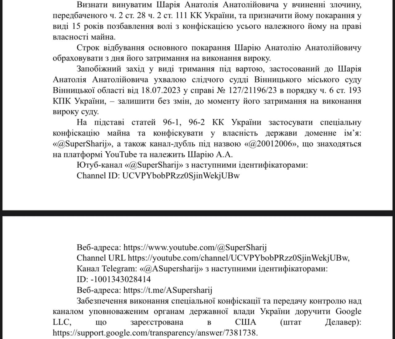 Суд в Виннице приговорил Анатолия Шария к 15 годам тюрьмы, у него заберут YouTube-канал (документ)
