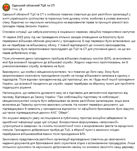 "Священнослужителя принуждали и принуждают к подписанию контракта на военную службу, угрожая и оказывая психологическое давление, перевозя в различные отделения ТЦК и воинские части Одесской области и Украины", — указывают в Одесской епархии УПЦ.