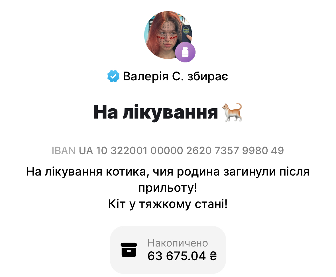 Она опубликовала срочный сбор на помощь кошке, украинцы уже задонатили более 63 тысяч гривен. В описании к "банке" указано, что семья домашней любимицы погибла после удара, а сама она находится в тяжелом состоянии.