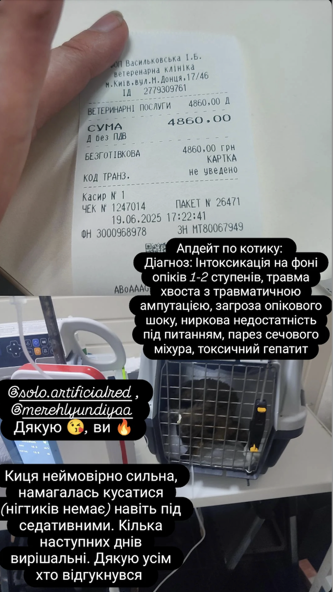 20 июня Герез посетила хвостатую пациентку клиники и показала, как она выглядит. Кошка находится под наблюдением ветеринаров, ведь угроза для ее жизни еще полностью не миновала.