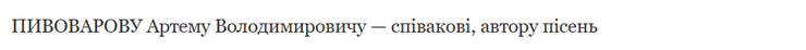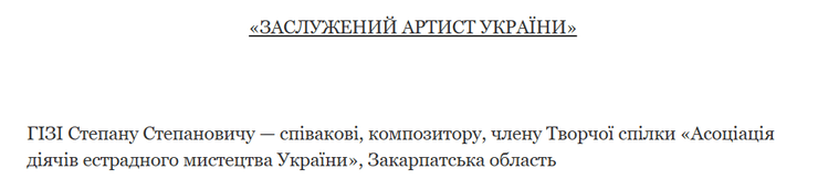 Президент Украины Владимир Зеленский присвоил звание "заслуженных артистов" поп-певцу Артему Пивоварову и сыну корифея эстрады, Степану Степановичу Гизе.