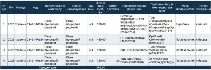 В качестве примера приводится то, что в мае в таблице появилось только 4 наименования компаний. Из них только одна компания подала заявку через Службу восстановления и развития Киевской области. Речь идет об ООО "Горнодобывающая компания-СБК", которое предлагает песок по 170 грн за кубометр.