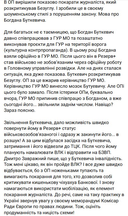 В частности, Береза написал, что журналист на самом деле официально работал в ГУР Минобороны и действительно занимался культурной контрпропагандой на территории РФ. По его мнению, мобилизация произошла из-за критики Безуглой, которая якобы вызвала "истерику в офисе президента". После этого журналиста уволило ГУР под давлением "Банковой" и на него "устроили засаду работники ТЦК". Экс-нардеп уверен, что у Буткевича есть инвалидность, и поэтому не ясно, как тот прошел военно-врачебную комиссию.