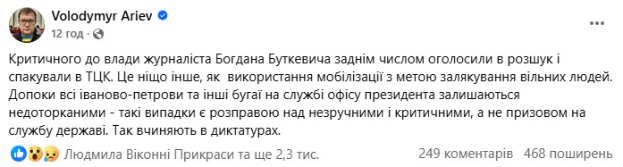 Однозначная критика власти и мобилизации Буткевича — в сообщениях в соцсетях экс-нардепа Борислава Березы, экс-военного Романа Червинского, журналистки Алены Яхно и подсанкционного экс-политика Игоря Мосийчука.