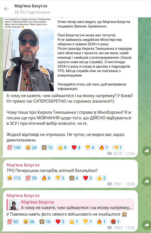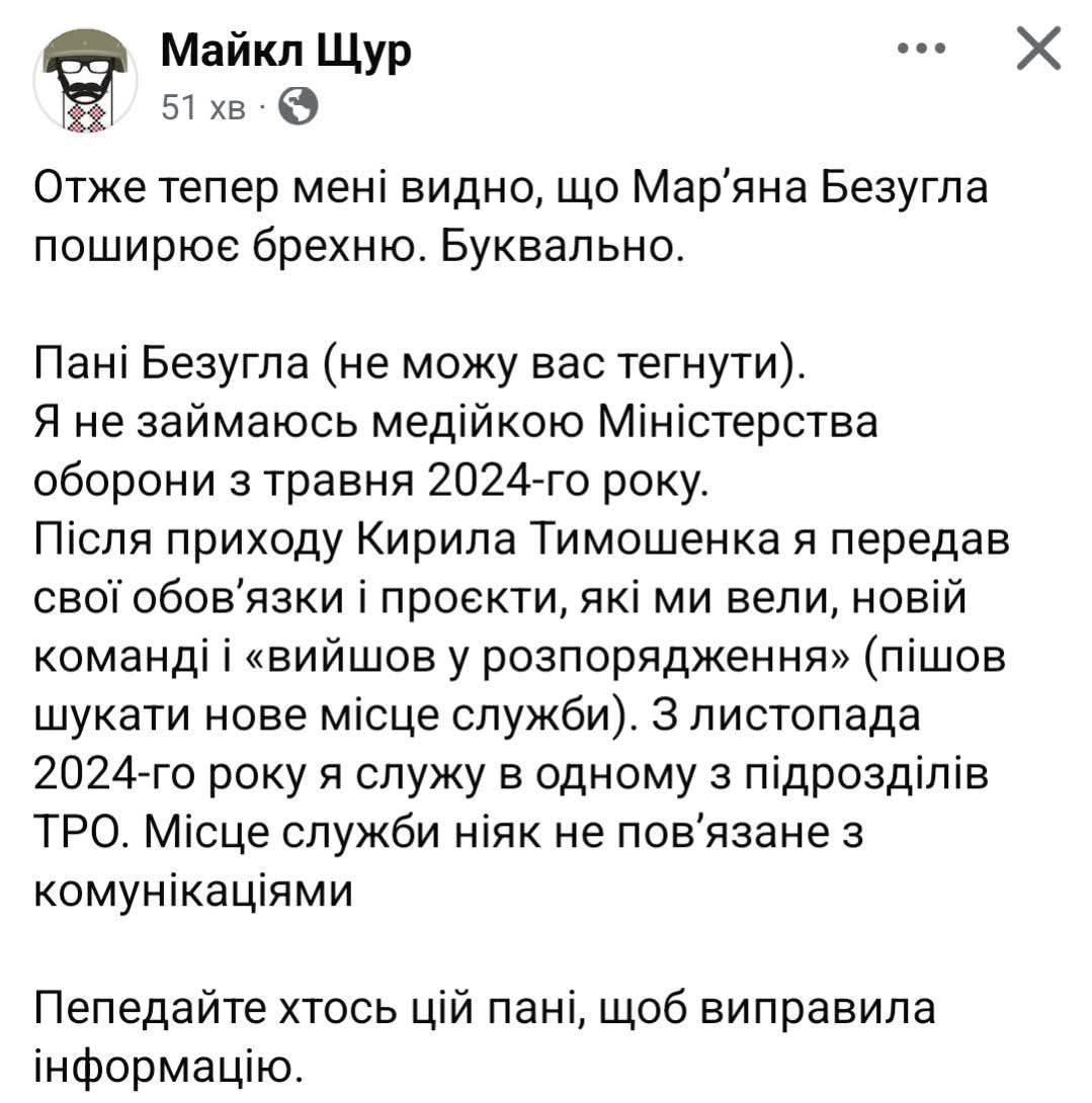 В свою очередь Майкл Щур отметил в Facebook, что служит в одном из подразделений ТРО, где его деятельность никак не связана с коммуникациями. Он подчеркнул, что покинул "медийку" Минобороны в мае 2024 года.