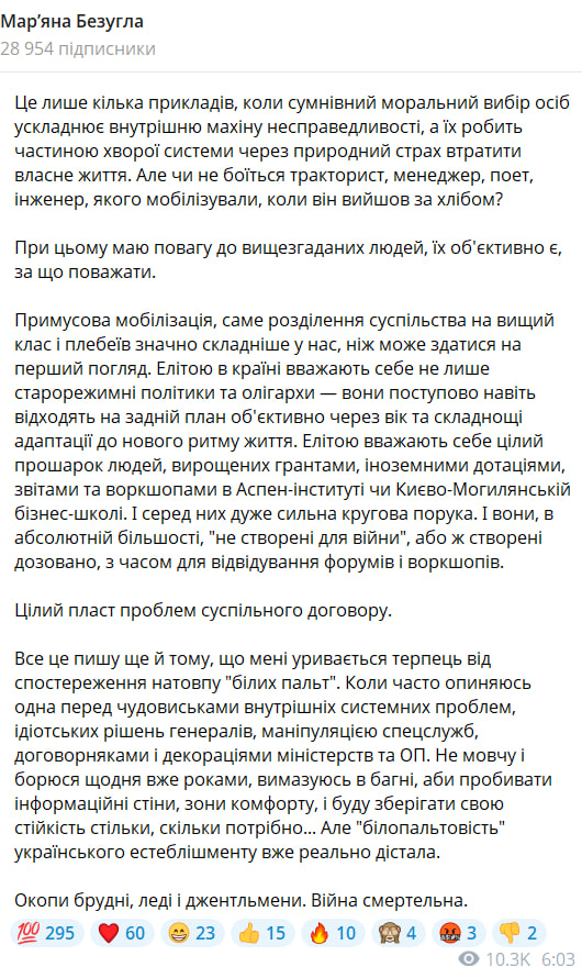"Элитой считают себя целая прослойка людей, выращенных грантами, иностранными дотациями, отчетами и воркшопами в Аспен-институте или Киево-Могилянской бизнес-школе. И среди них очень сильная круговая порука. И они, в абсолютном большинстве, "не созданы для войны", или же созданы дозированно, со временем для посещения форумов и воркшопов", — заявила Безуглая.