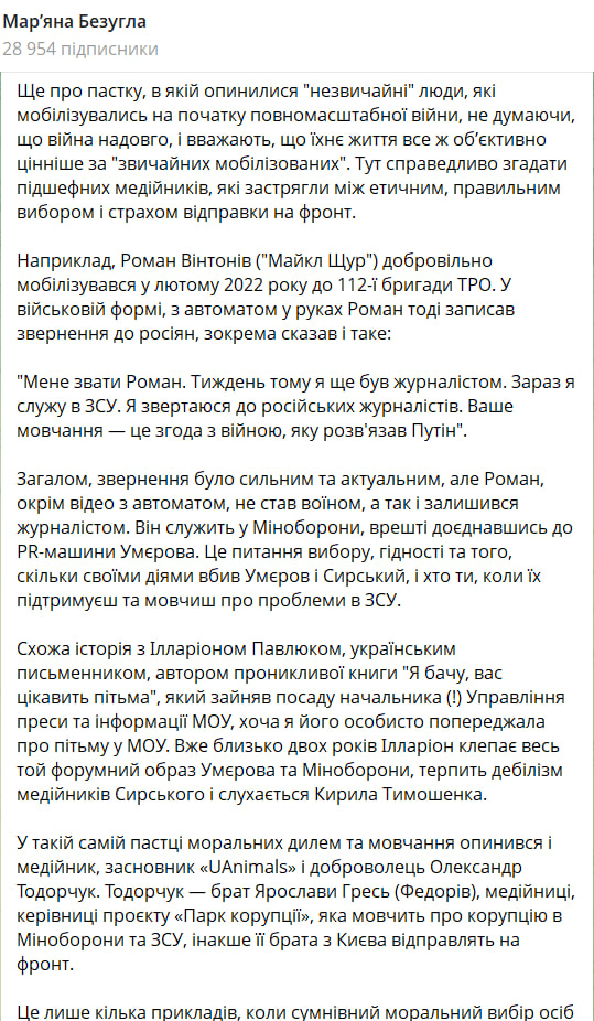 "Он служит в Минобороны, в конце концов присоединившись к PR-машине Умерова. Это вопрос выбора, достоинства и того, сколько своими действиями убил Умеров и Сырский, и кто ты, когда их поддерживаешь и молчишь о проблемах в ВСУ", — написала Безуглая.