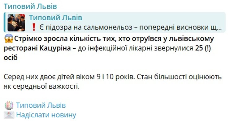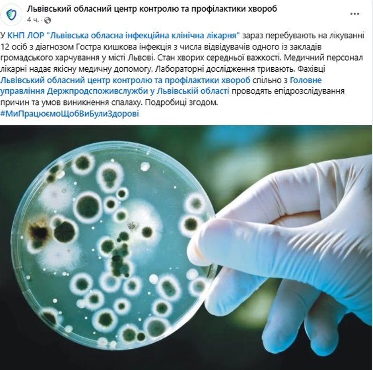 В свою очередь Львовский областной центр контроля и профилактики болезней сообщил, что в областной инфекционной больнице находятся 12 человек с диагнозом "острая кишечная инфекция". Все они посещали одно из заведений общественного питания во Львове.