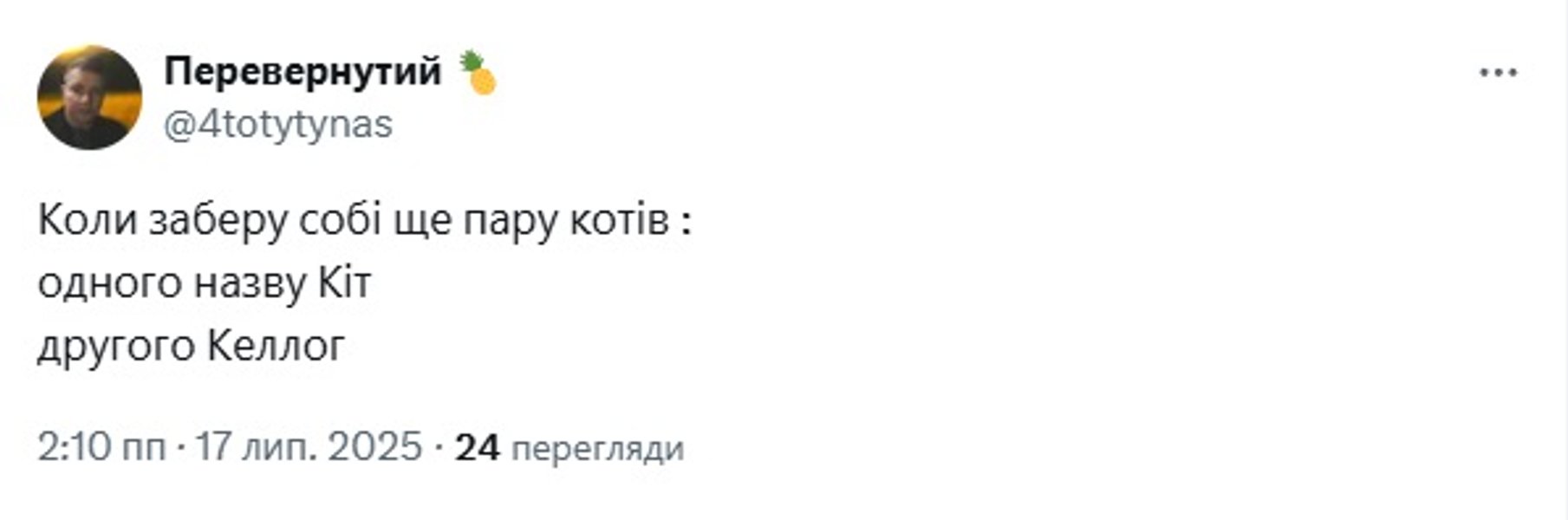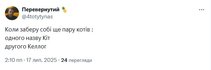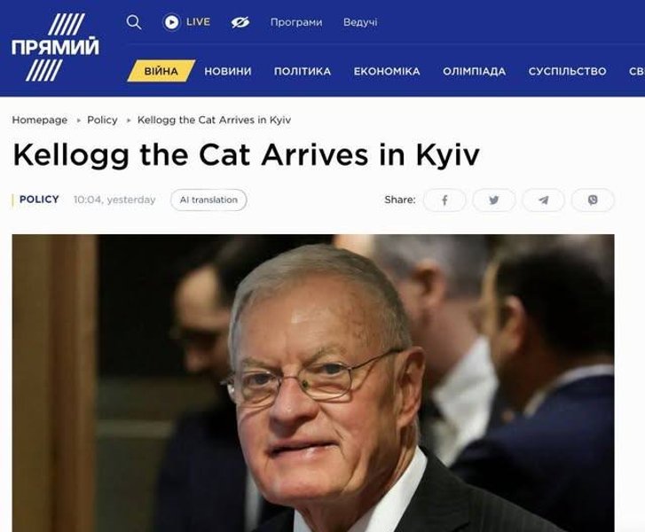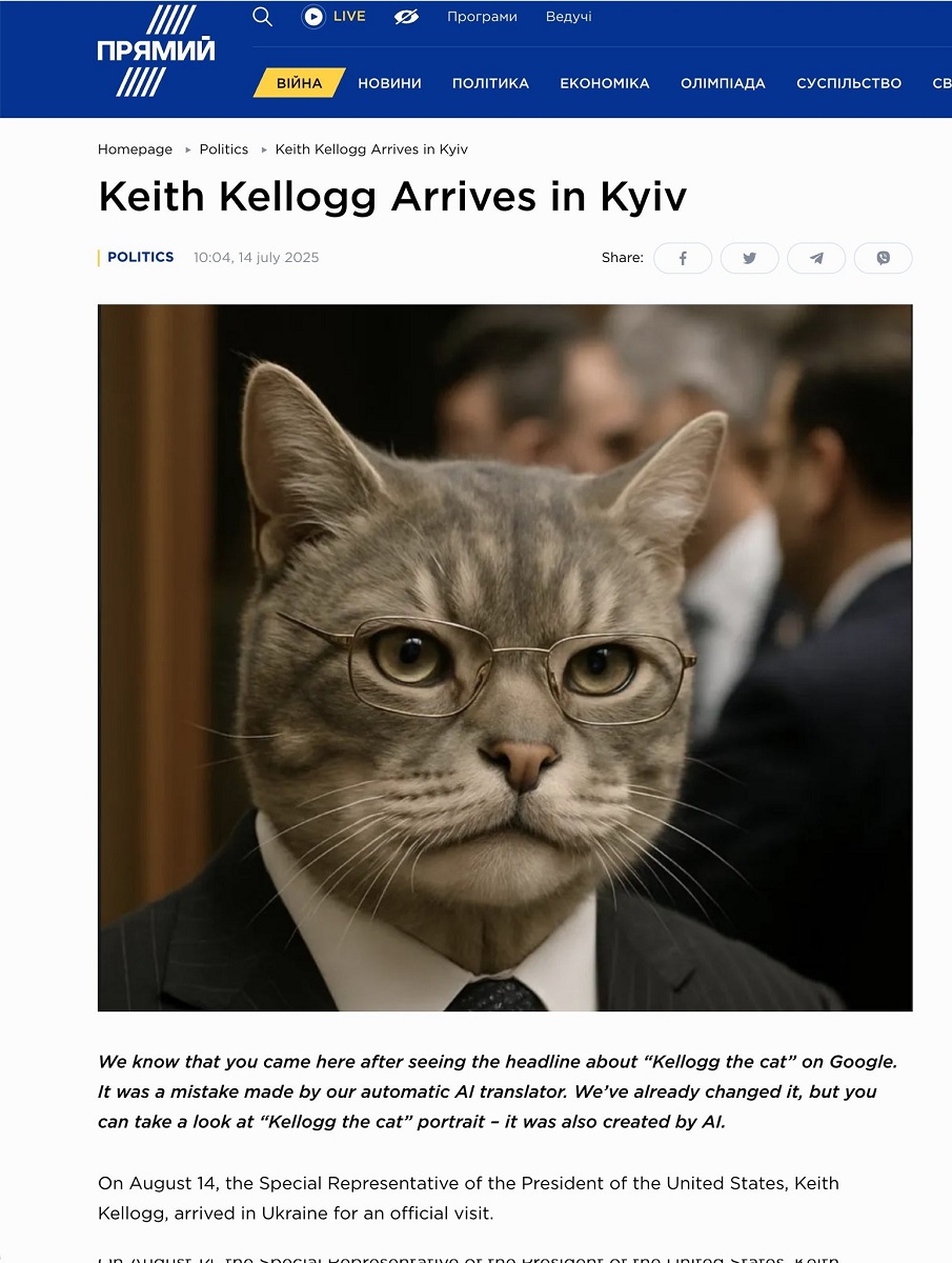 Но потом получил развитие, когда телеканал "Прямой" перевел новость на английский с украинского с помощью ИИ и Кит Келлог превратился в кота Келлога: "Kellogg the Cat Arrives in Kyiv".