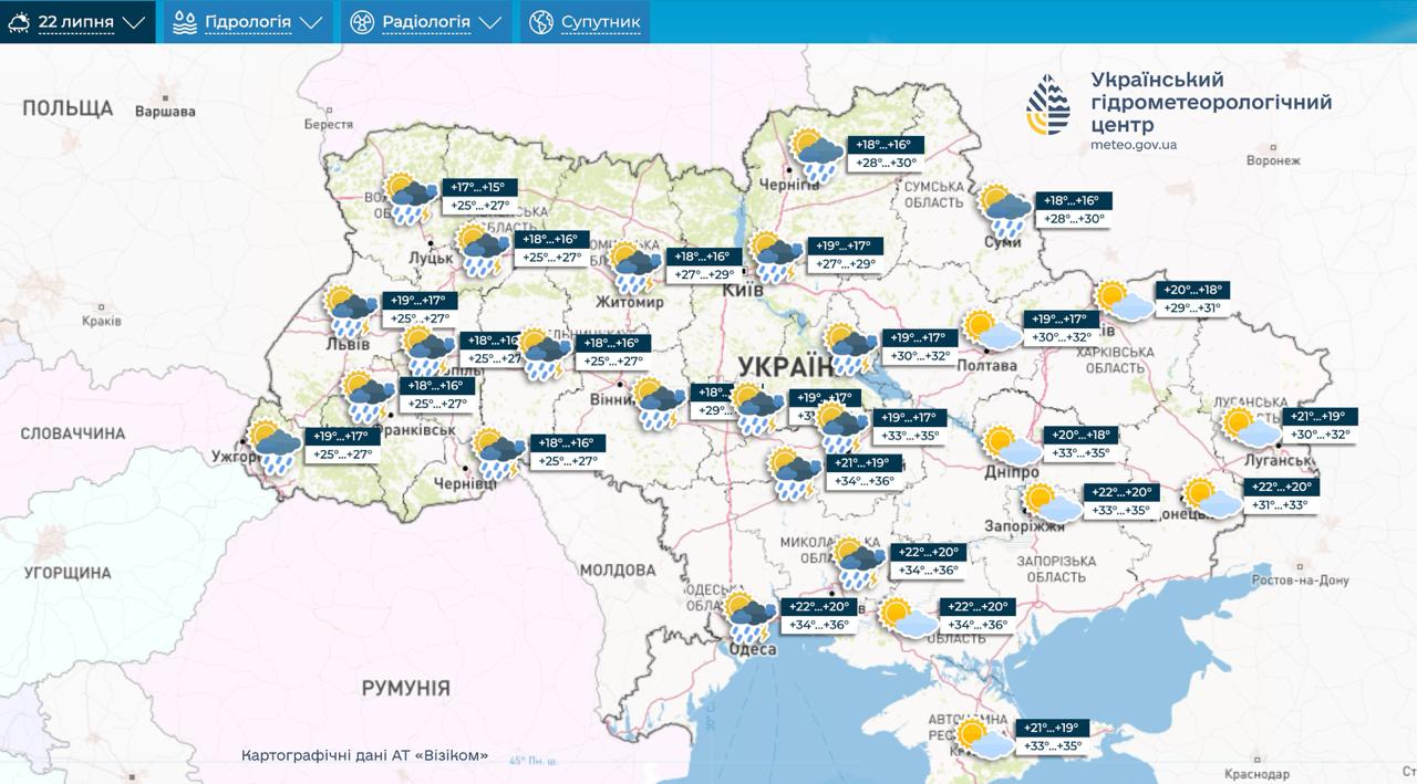 По словам Диденко, температура воздуха будет составлять во вторник +29+34 градуса, на юге и юго-востоке +32+36 градусов. Лишь в западных областях ожидается 22 июля +23+27 градусов.