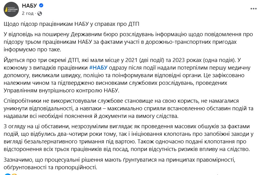 Еще одно заявление бюро касается информации о расследовании ДТП, к которым причастны работники НАБУ. Ведомство заявило, что речь идет об инцидентах, которые произошли два-четыре года назад. Работники не уклонялись от ответственности, помогали пострадавшим, не прикрывались должностями, отмечается в заявлении пресс-службы.