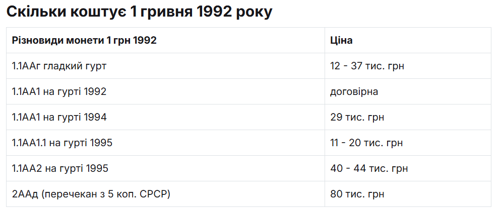 Самые дорогие — экземпляры от 1992 года разновидности "1.1ААг" с гладким гуртом без надписи. За нее могут заплатить от 12 до 37 тысяч гривен.