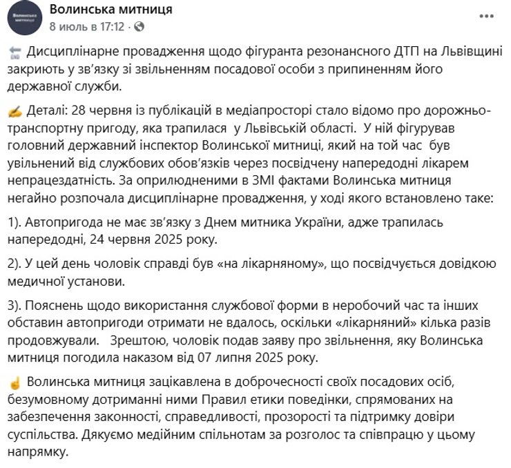 "Объяснений по использованию служебной формы в нерабочее время и других обстоятельств происшествия получить не удалось, поскольку "больничный" несколько раз продолжали. В конце концов мужчина подал заявление об увольнении, которое Волынская таможня согласовала приказом от 07 июля 2025 года", – добавили в Волынской таможне.
