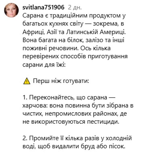 Еще одна сфера применения саранчи – кулинария. В соцсетях уже много рецептов, где блогеры показывают, как ее готовить, утверждая, что это очень быстро и очень вкусно.