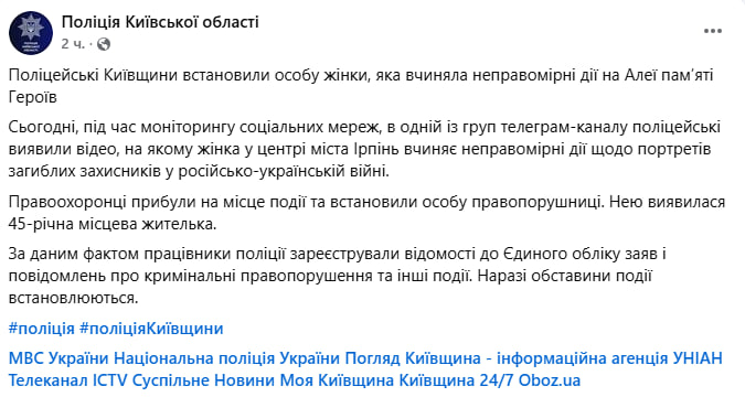 Как сообщает полиция Киевщины, во время мониторинга соцсетей правоохранители обнаружили видео инцидента в одном из местных телеграмм-каналов. На кадрах зафиксировано, как 45-летняя местная жительница совершает неправомерные действия на Аллее памяти Героев.