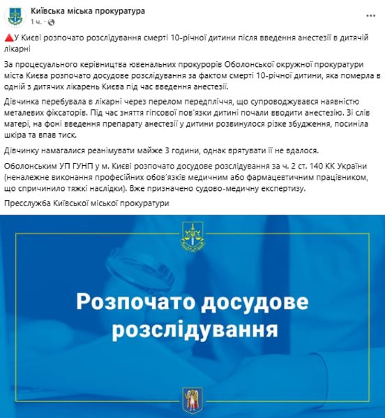 В Киеве открыто уголовное производство из-за смерти 10-летней девочки во время введения анестезии в одной из детских больниц. Следствие выясняет обстоятельства трагедии и возможную ненадлежащую медицинскую помощь.