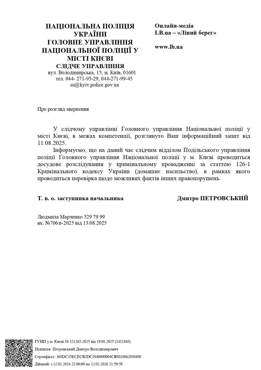 Журналисты издания LB.ua поинтересовались у правоохранителей, начали ли органы уголовное производство в отношении актера Театра на Подоле Константина Темляка. На это правоохранители ответили, что проводится досудебное расследование в уголовном производстве по статье 126-1 Уголовного кодекса Украины о домашнем насилии. Об этом издание сообщило 19 августа.