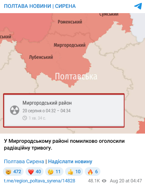 Об ошибочном объявлении радиационной тревоги в Миргородском районе Полтавской области также писал Telegram-канал "ПОЛТАВА НОВОСТИ | СИРЕНА".