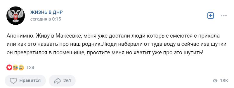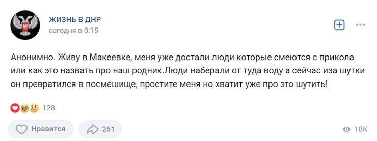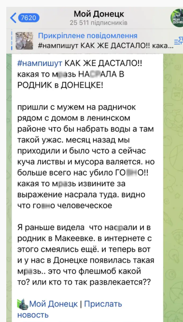 "Кто-то нас*ал в родничок в Макеевке на Объединенном, где люди набирают себе питьевую воду. Тварь".