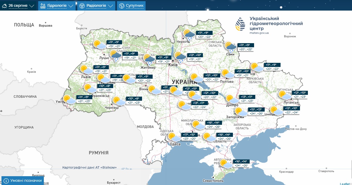 Укргидрометцентр на 25 августа прогнозирует от +19 до +26 градусов тепла, самая высокая температура будет на юге страны.