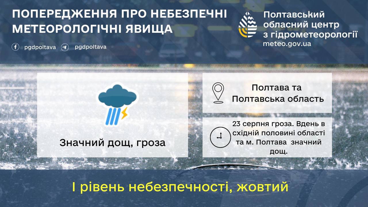 Полтавский областной гидрометцентр предупреждает, что в субботу, 23 августа, в Полтаве и области ожидаются грозы и ливни.