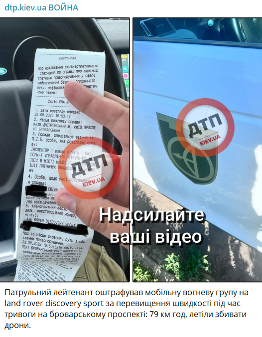 В тексте постановления можно увидеть, что штраф наложен 23 августа на водителя автомобиля Land Rover Discovery Sport за движение по Броварскому проспекту со скоростью 79 км/ч — более чем на 20 км/ч больше разрешенной. По словам админов канала, на этом авто мобильная огневая группа ехала сбивать дроны, которые уже двигались по Черниговской области. В постановлении указано время 16:53. При этом Черниговская областная государственная администрация сообщала об объявлении воздушной тревоги 23 августа в 16:46.
