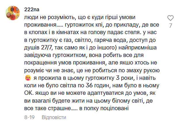 Одна из комментаторов считает, что условия в общежитии не самые плохие и студентам стоит адаптироваться
