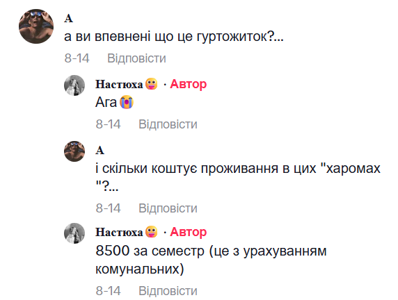 Автор видео в комментариях ответила, что за семестр вместе с коммунальными услугами проживание в общежитии академии Бойчука стоит 8 500 грн.