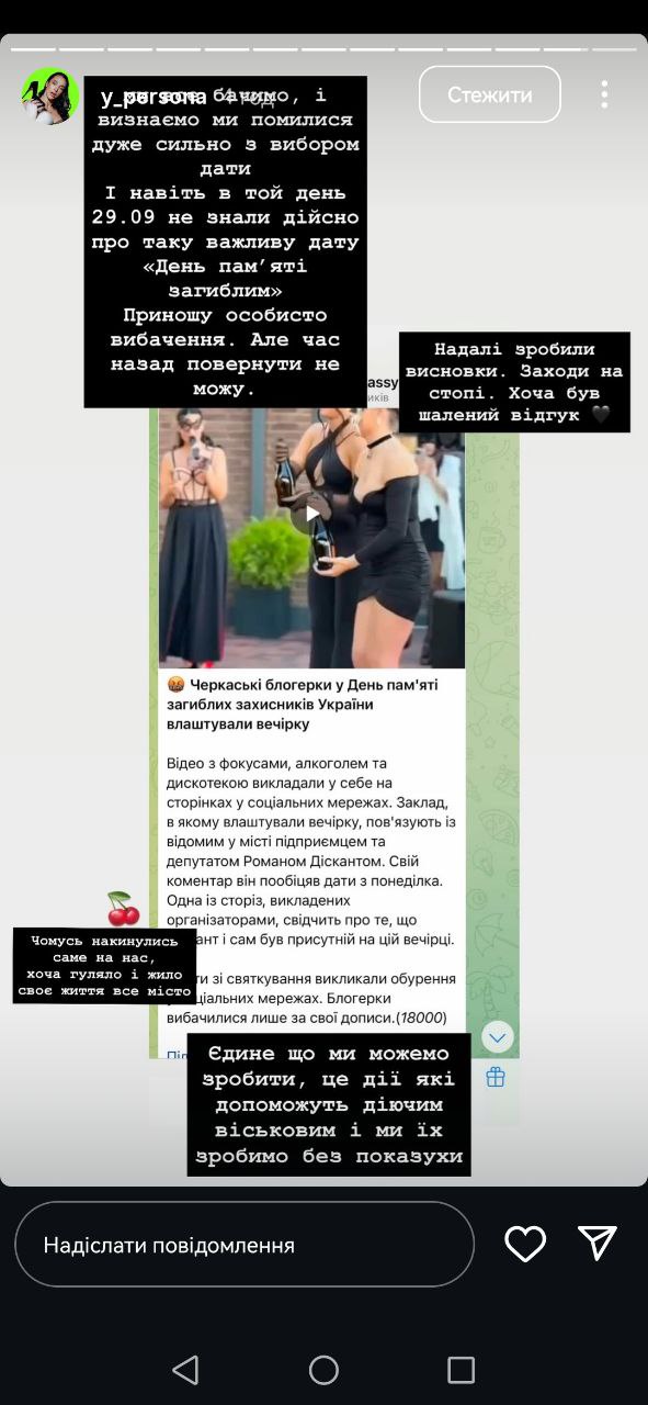 Относительно Дня памяти погибших защитников Украины, одна из организаторов призналась в Instagram Stories, что не знала об этой важной дате, в том числе в день проведения мероприятия. Она подчеркнула, что признает ошибку и уже сделала выводы из ситуации.