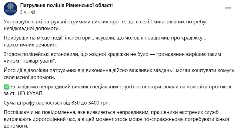 2 сентября патрульные Ривненщины выехали на сообщение о якобы краже наркотиков в селе Смыга, однако выяснилось, что вызов был ложным. Мужчина, который его сделал, просто пошутил, отвлекая правоохранителей от реальной работы.