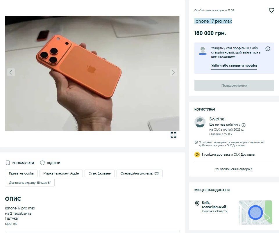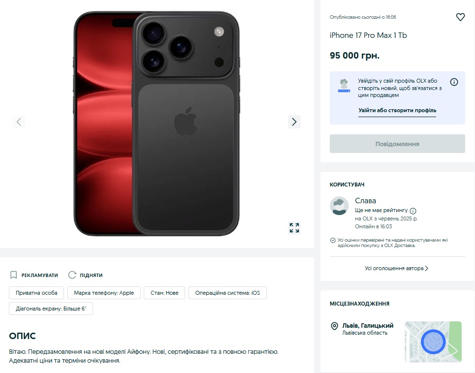 Объявления стали появляться, как в интернет-магазинах, так и на онлайн-площадках. Причем новый iPhone 17 Pro Max продают за 180 тысяч гривен, что на три тысячи долларов больше, чем оригинальная цена.