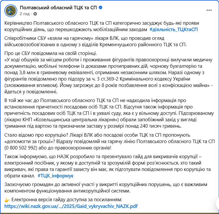 По поводу опровержения информации о коррупции, в ТЦК Полтавщины призвали граждан сообщать об известных случаях коррупционных практик в медицинских учреждениях или среди сотрудников территориальных центров комплектования.
