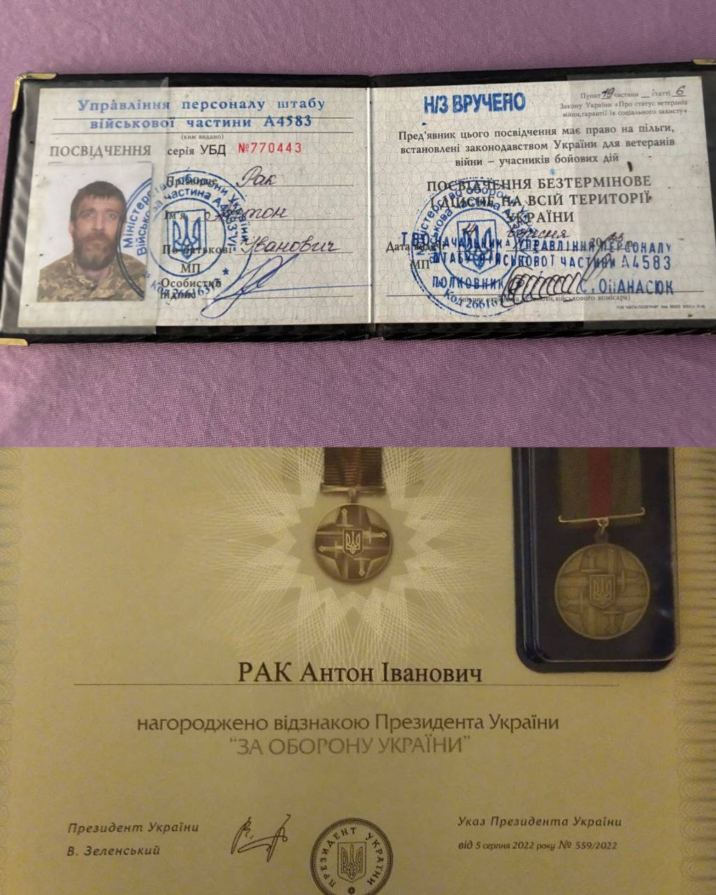 В сети также появились фотография документа военного — удостоверение участника боевых действий на имя Антона Рака. Его наградили президентским знаком отличия "За оборону Украины".