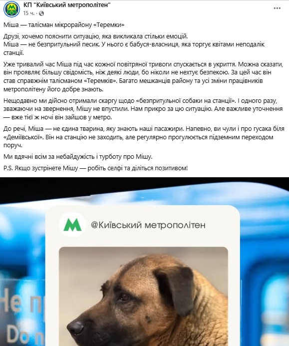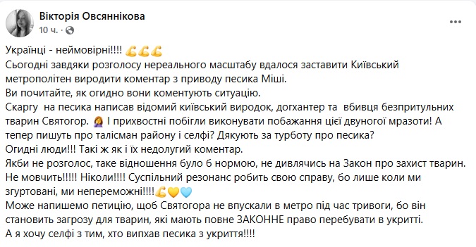 "Но один мудак (которого знают в Киеве, как догхантера убийцу животных) пожаловался, что собака ему мешает. Неуважаемый господин, вы не думали, что это именно вы мешаете людям, и далеко не всем приятно быть рядом с вами? Из-за этой жалобы работники станции запретили пускать Мишу в метро во время тревог. Вчера он стоял у двери, и его не пустили. Более того – выгнали!" – написала она и потребовала от сотрудников метрополитена разрешить животному снова быть в безопасности.