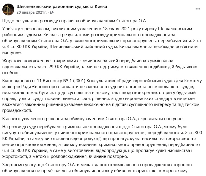 В 2021 году Шевченковский районный суд постановил, что Святогор, кроме непосредственного участия на теле- и радиопередачах, в которых имели место его высказывания о физическом уничтожении бездомных животных, никаких действий, связанных с изготовлением видеопродукции упомянутых передач, не совершал.