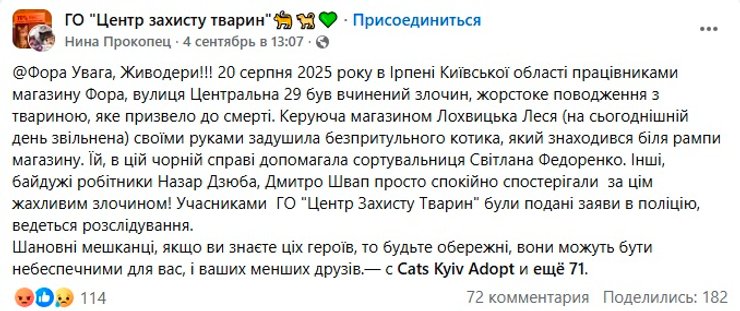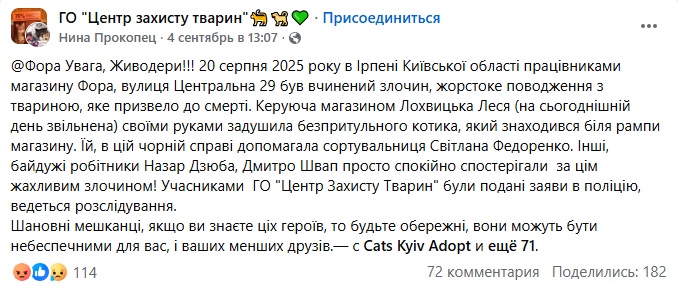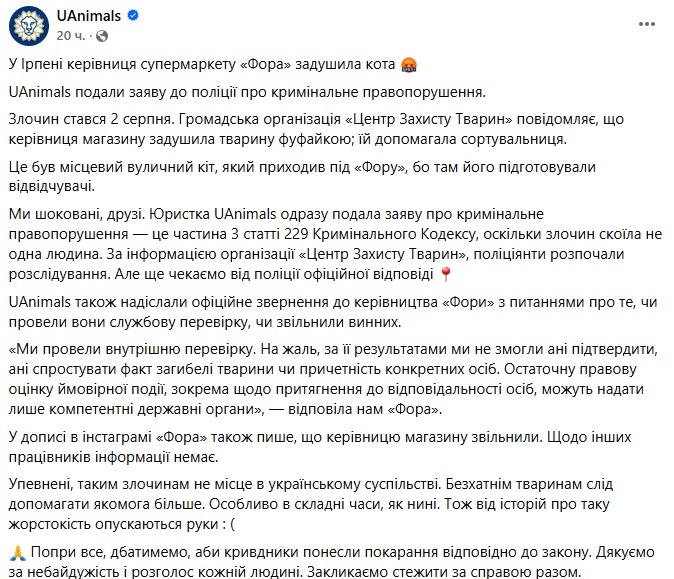 В сети набирает обороты скандал, связанный с жестоким убийством кота в супермаркете "Фора" в Ирпене. Несмотря на то, что инцидент имел место почти месяц назад, громко о нем заговорили только сейчас. В дело вмешался даже народный депутат, а торговая сеть уже прокомментировала ситуацию.