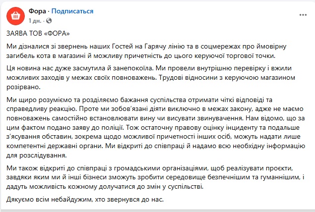 В нем говорится, что о гибели кота в магазине и возможной причастности к этому управляющей торговой точки сотрудники ООО "Фора" узнали из обращений клиентов на горячую линию и соцсетей.