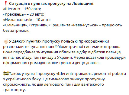 Пункт пропуска "Шегини" — самый загруженный: здесь образовалась очередь из около 150 автомобилей. Дополнительно пропускную способность ограничивают ремонтные работы на украинской стороне, что временно затрудняет движение как легкового, так и грузового транспорта".