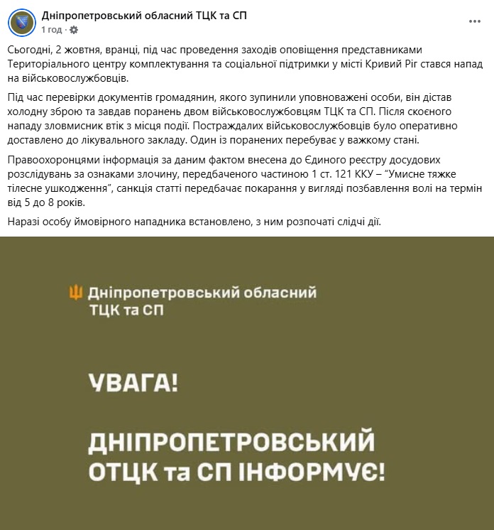 Инцидент произошел утром 2 октября, когда военнослужащие территориального центра комплектования и социальной поддержки занимались оповещением в Покровском районе Кривого Рога.