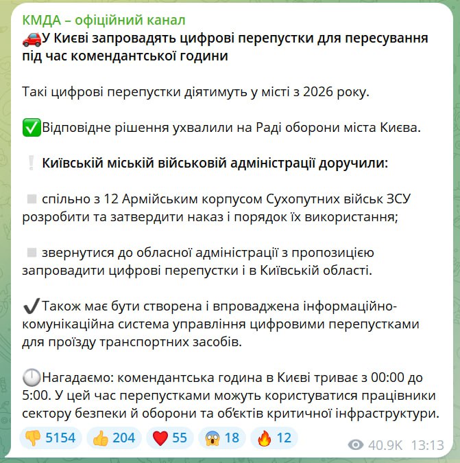 В Киеве с 2026 года введут цифровые пропуска для передвижения во время комендантского часа. Они будут нужны работникам безопасности, обороны и критической инфраструктуры.