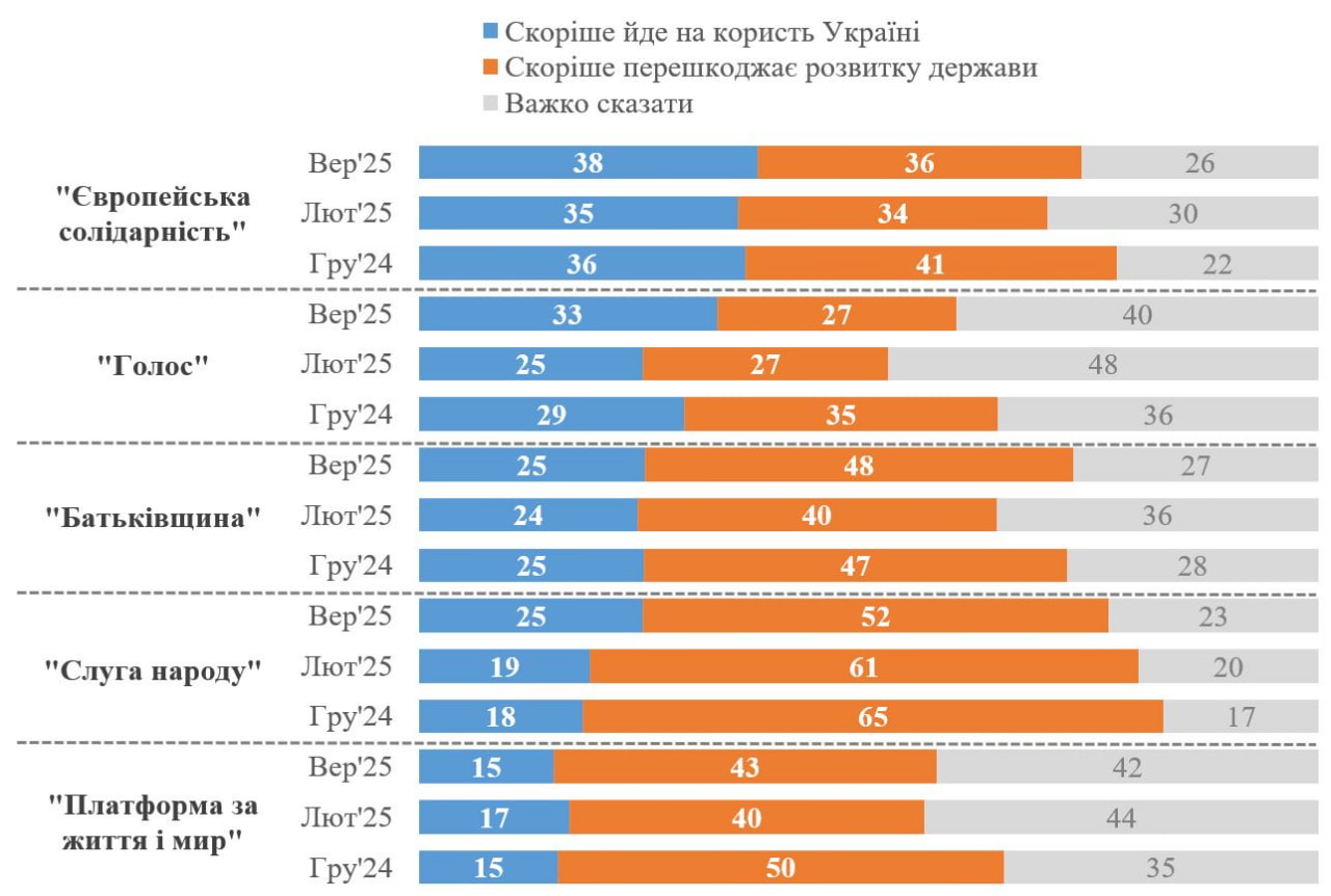 Среди других парламентских сил самый высокий уровень поддержки демонстрирует "Европейская Солидарность": 38% украинцев считают ее деятельность полезной для государства, тогда как 36% — противоположного взгляда. По сравнению с началом года показатели для этой фракции практически не изменились.