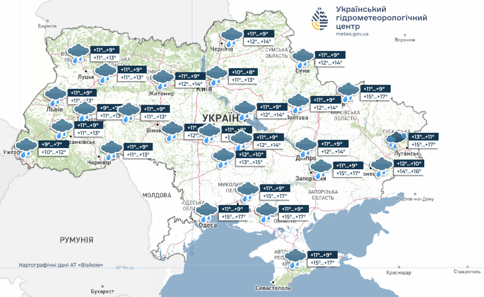 По данным Укргидрометцентра, ночью температура будет опускаться до 9-11 градусов тепла. Несколько теплее ночь будет на востоке, а самой холодной — на Закарпатье. Дожди прогнозируют абсолютно по всей территории страны.