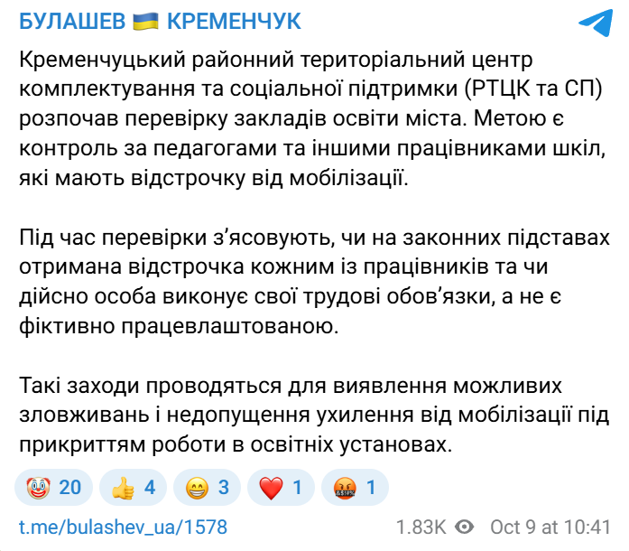 По словам журналиста Олега Булашева, сотрудники районного ТЦК проводят проверки учебных заведений в Кременчуге Полтавской области. Проверяют законность получения отсрочки каждым из педагогов и других работников школ.