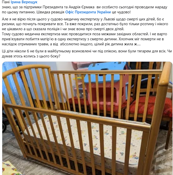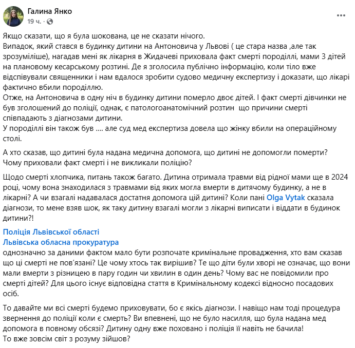"Что касается смерти мальчика, вопросов тоже много. Ребенок получил травмы от родной мамы еще в 2024 году, почему он находился с травмами, от которых мог умереть в детском доме, а не в больнице? А оказывалась ли вообще достаточная помощь этому ребенку? Когда госпожа Ольга Витак сказала диагнозы, то меня шокировало, как такого ребенка вообще могли из больницы выписать и отдать в дом ребенка?!" – написала Янко.