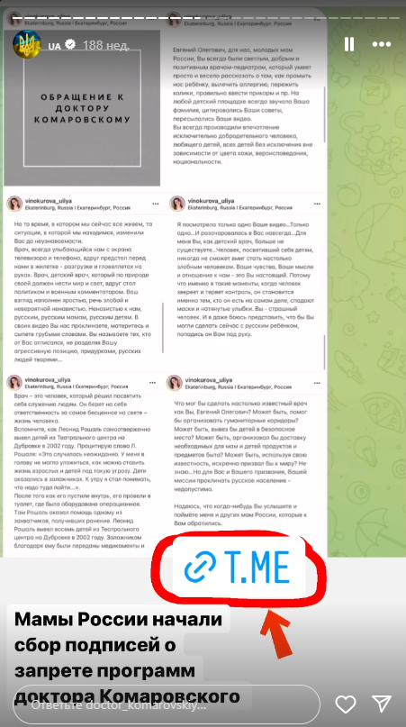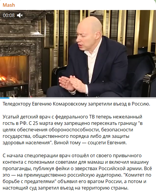 "С начала спецоперации врач отошел от своего привычного контента с полезными советами для мамаш и включил машину пропаганды, публикуя фейки о зверствах Российской армии. Все это — на преимущественно российскую аудиторию. "Комитет по борьбе с предателями" объявил его врагом России, а потом и настоящий суд запретил въезд на территорию страны", – гласит публикация.