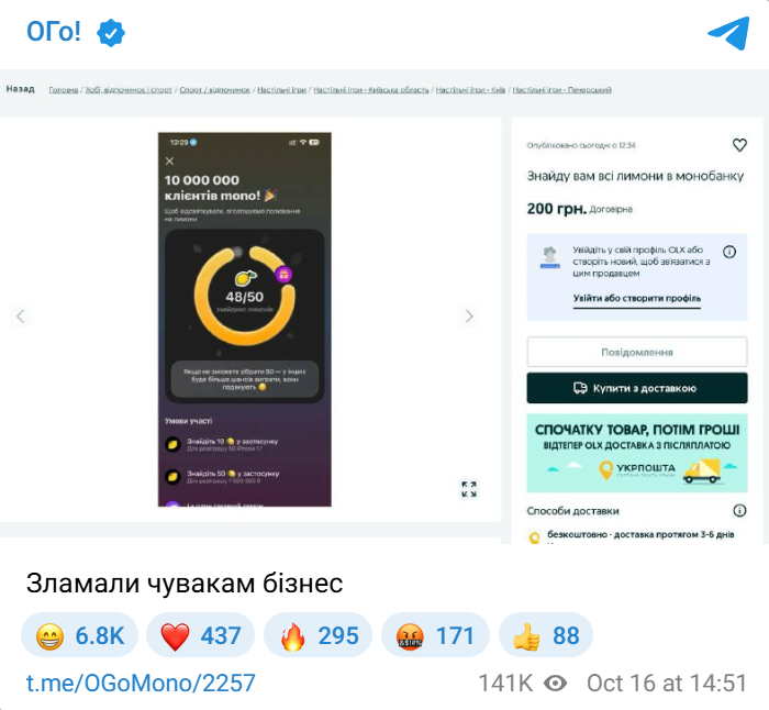 Скриншот одного из таких объявлений о поиске лимонов в "Монобанке" на OLX опубликовал в своем Telegram-канале соучредитель банка Олег Гороховский. В нем предлагается отыскать все 50 лимонов за 200 грн.