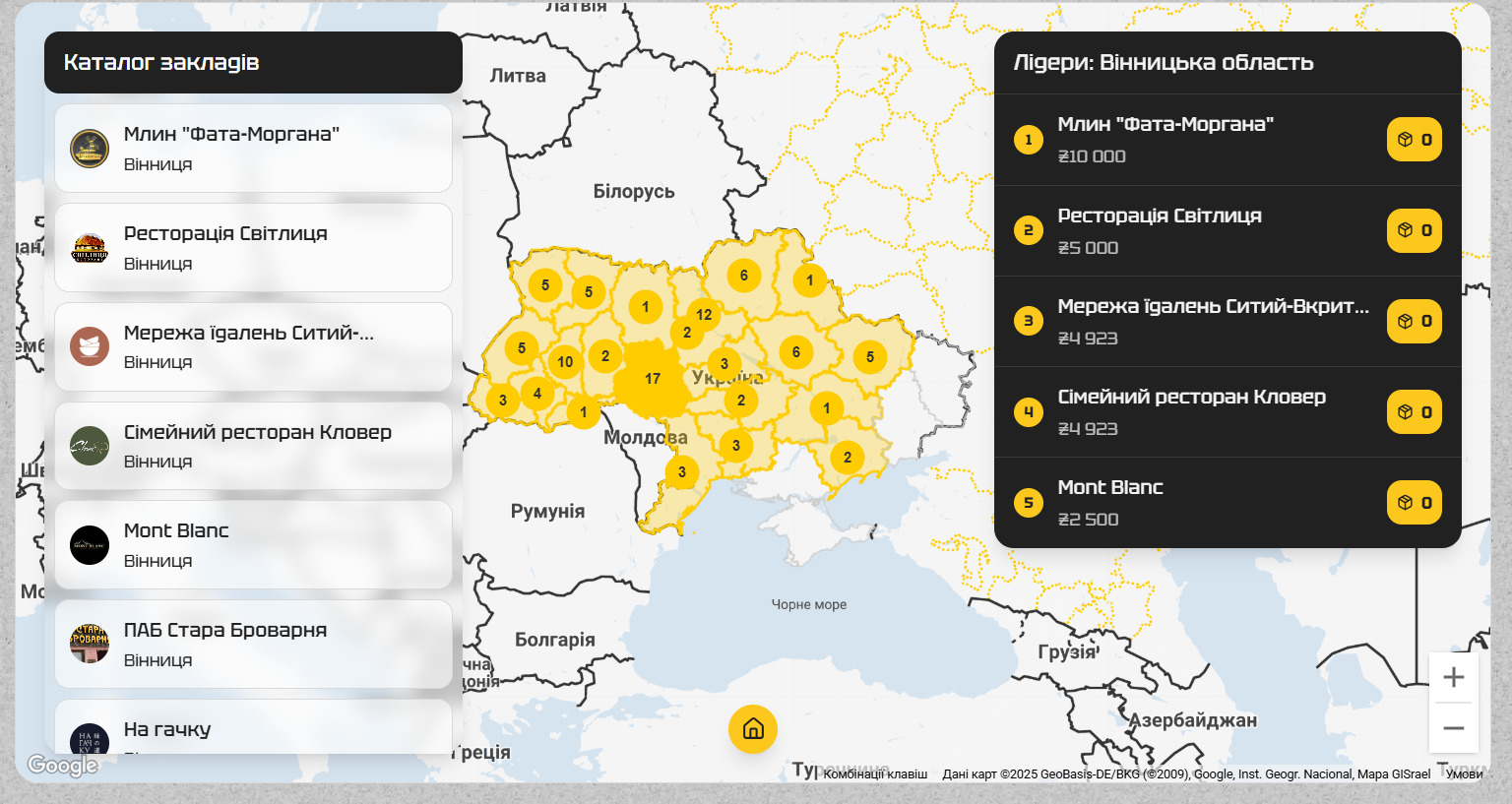 Сейчас в лидерах — Винницкая область с 17 заведениями, Киевская область с 15 заведениями и Тернопольская область с 10 заведениями. Также в Полтаве уже присоединилось 5 заведений, у одного из которых 13 точек по городу.